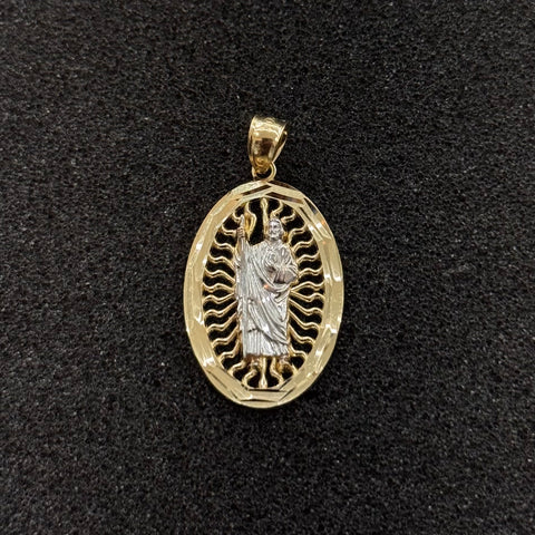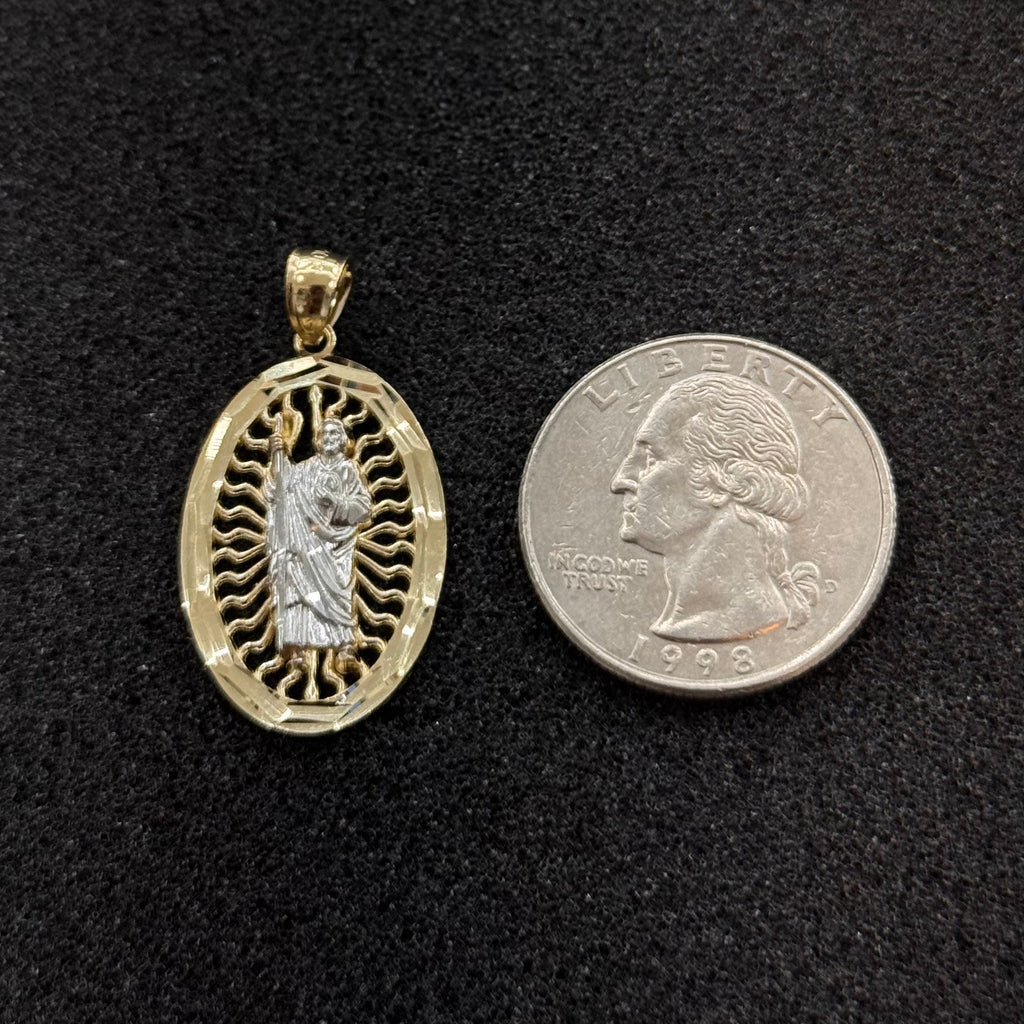 Este elegante dije de San Judas Tadeo en oro sólido 10K bicolor es una joya de gran significado espiritual, reconocido como el santo de las causas difíciles y la esperanza. Su diseño ovalado presenta la figura central de San Judas en oro blanco, rodeada por un marco calado en oro amarillo con acabado brillante que realza cada detalle.