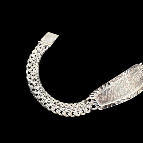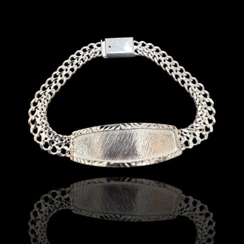 Placa Central: Cuenta con una placa rectangular ligeramente curva, diseñada para ser grabada (nombres, fechas o iniciales). Tiene un acabado cepillado o satinado en el centro y un borde con cortes de diamante que le dan mucho brillo.