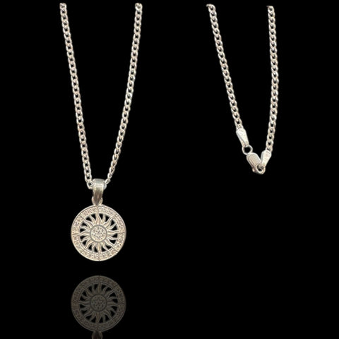 Radiate confidence and style. This beautiful Sun Medallion pendant and chain set is the perfect accessory for those who carry their own light. Featuring an intricate Radiant Sun design with a textured border, this piece captures a bohemian spirit with a sophisticated touch. Crafted entirely from authentic .925 Sterling Silver, it offers the perfect balance of durability and a high-shine finish.